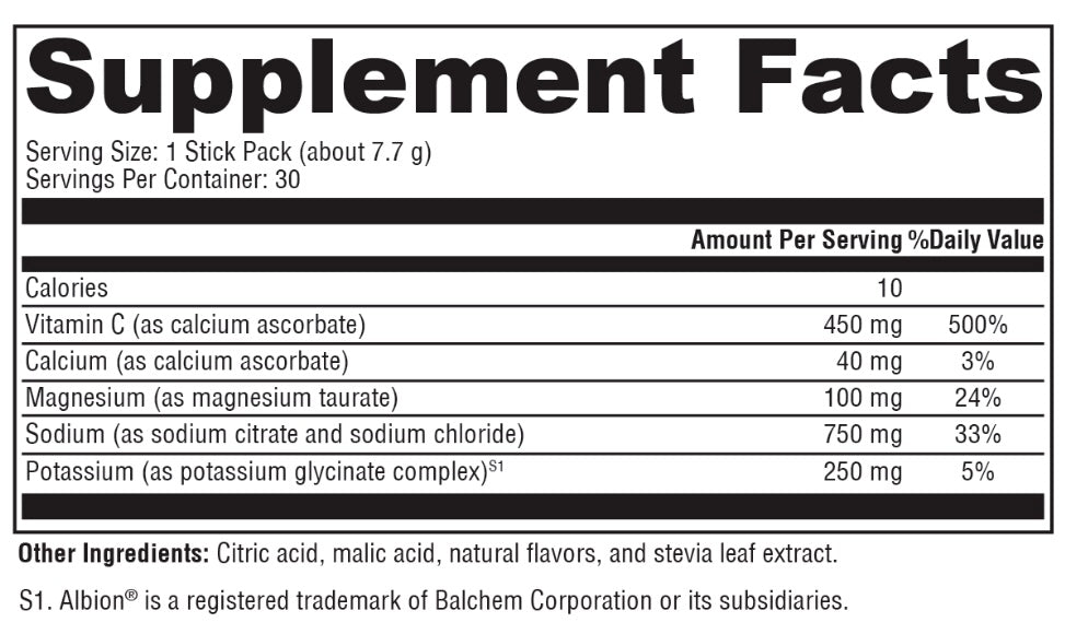 Electrolyte Sticks is a tangy lemon-lime drink designed to support rehydration by replenishing electrolytes that are vital to fluid balance. Whether you’re a trained athlete or a weekend warrior, this sugar-free, vitamin C–infused blend helps maintain optimal cellular hydration and supports the replacement of electrolytes lost during intense physical activity or exposure to extreme weather conditions. The NSF Certified for Sport® designation ensures this product does not contain substances banned by major athletic organizations.*